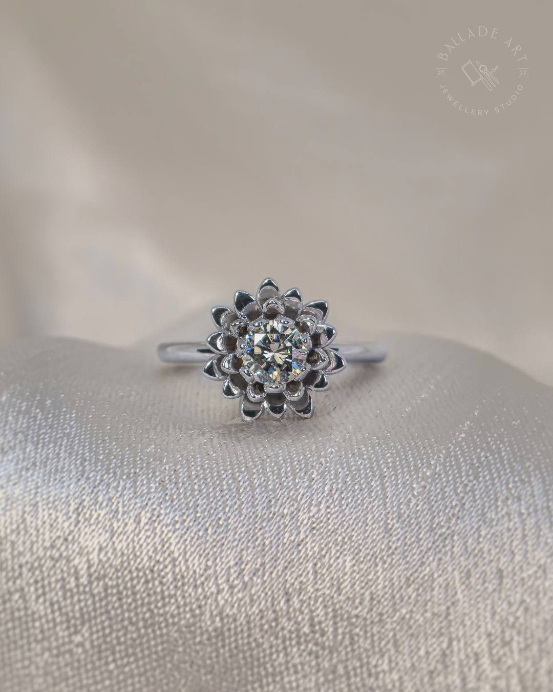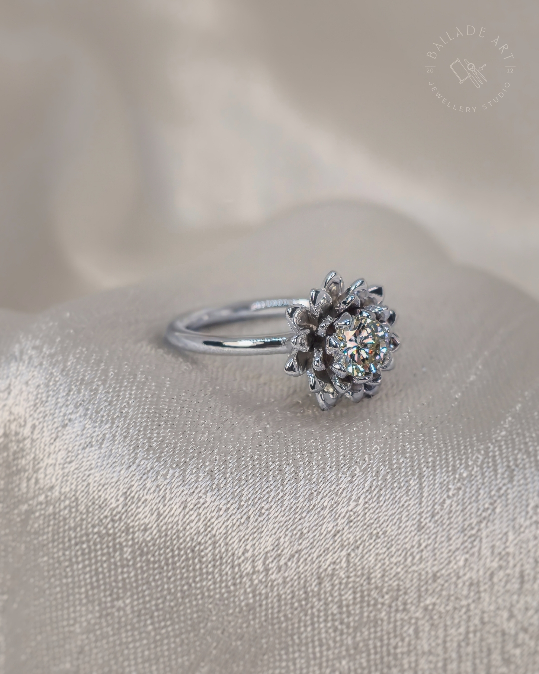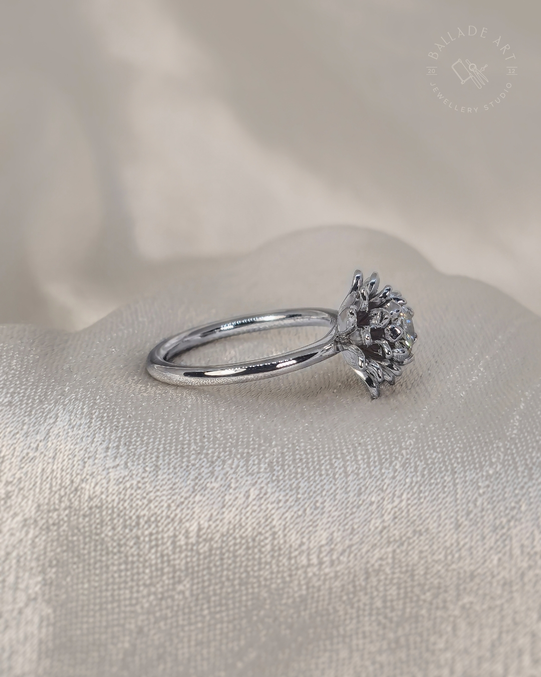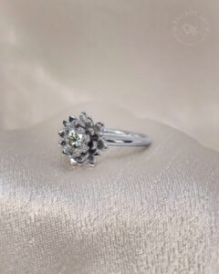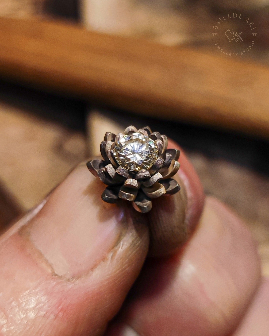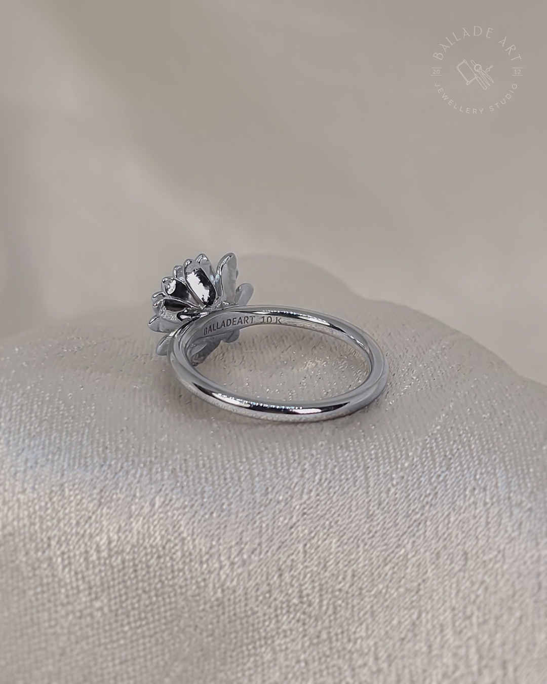 Doğanın zarafetinden ilham alan açılmış kozalak formu, BalladeArt atölyesinde tamamen el işçiliği ile 10K Beyaz Altın’a işlendi.
