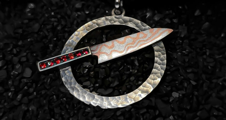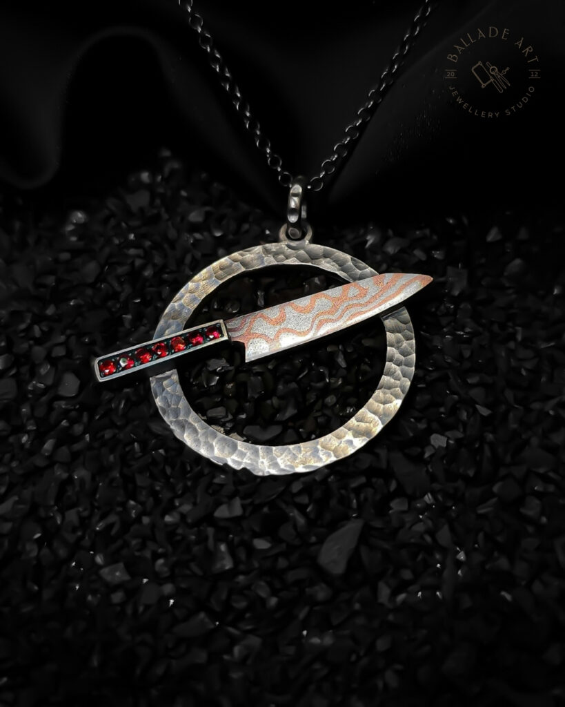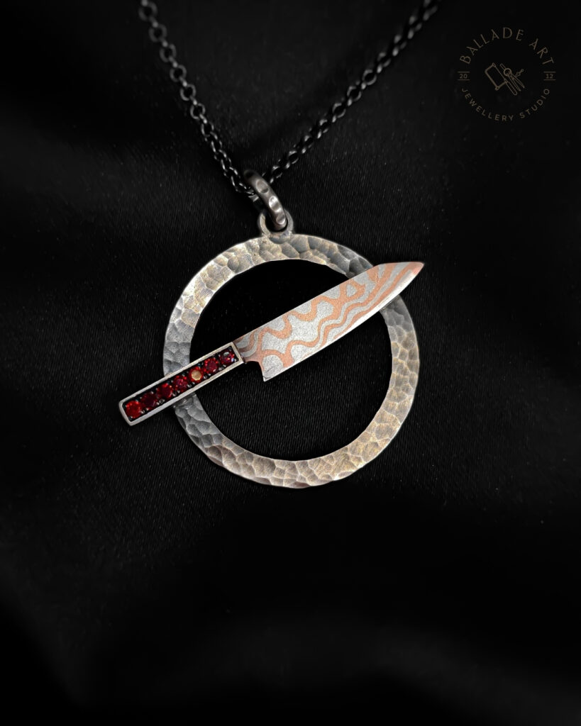 Bizden, özellikle bıçakta, “Damascus (Şam) Çeliği”ni anımsatan desenler olmasını rica etti. Biz de bunun için Bronz ve Gümüş’ü, Mokumegane tekniği ile evlendirdik Bıçağın sapını da Garnet taşları ile süsledik.