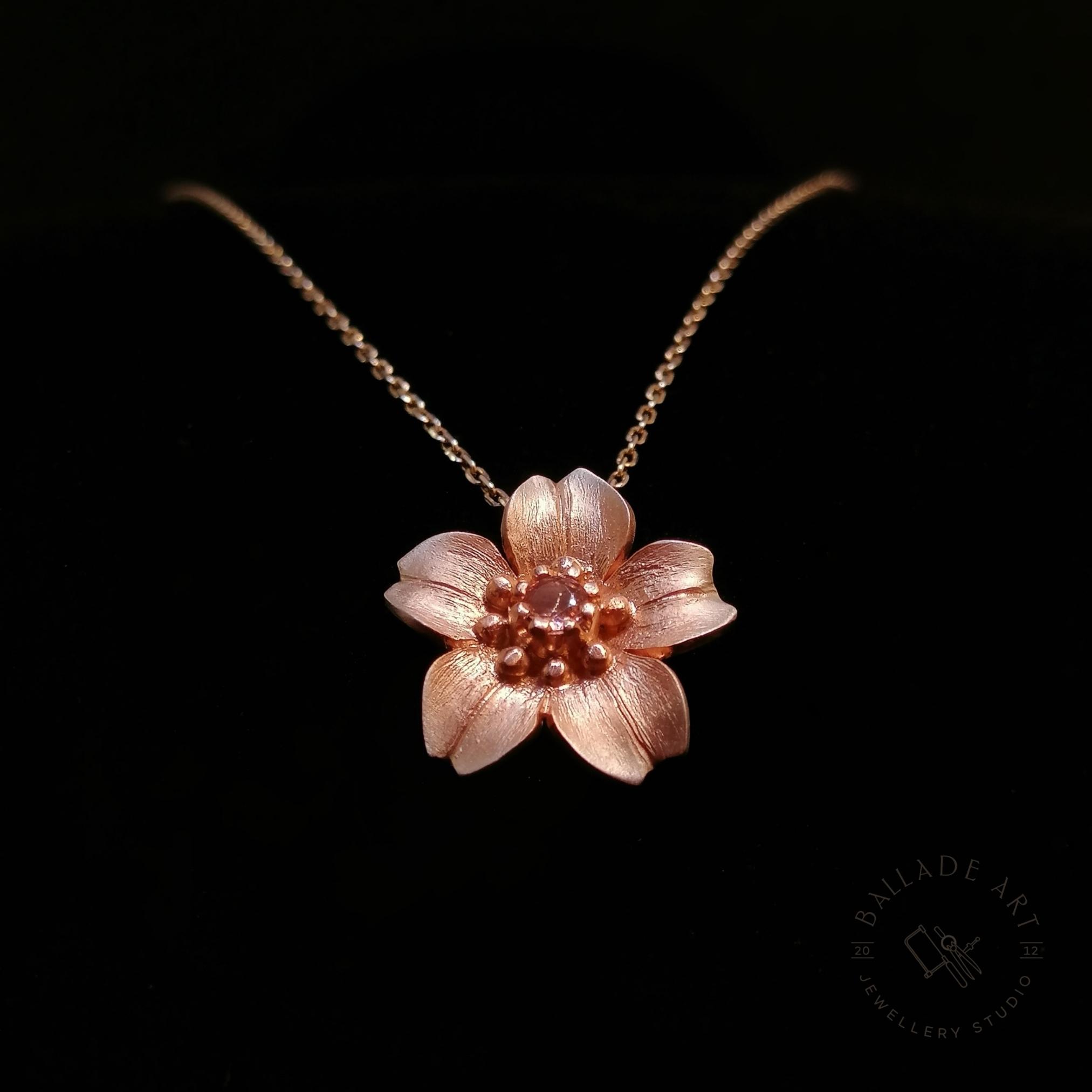 Sakura Necklace with Diamond, completely handcrafted in our workshop. It is a silver necklace inspired by “sakura”, the famous cherry blossoms of sweet Japan. We captured the pinkness of the flower with Rose Gold plating on silver. In the middle part, there is a Diamond Cut Pink Tourmaline.